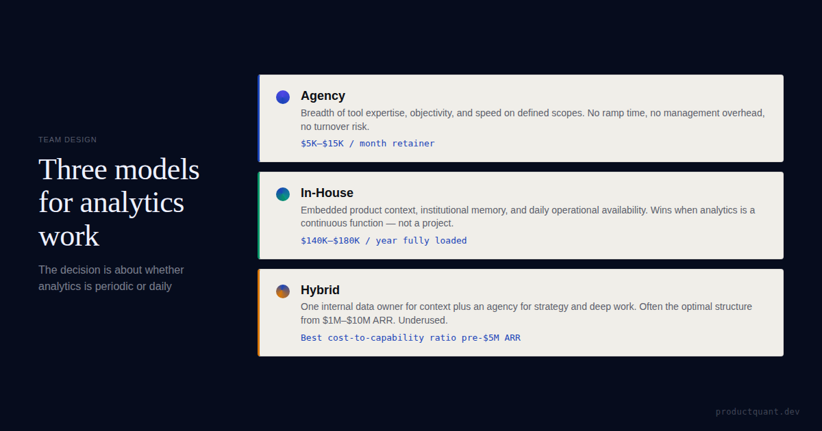 An honest comparison of product analytics agency vs. in-house team. Real cost numbers, capability gaps, when each model makes sense, and a decision framework by ARR stage.