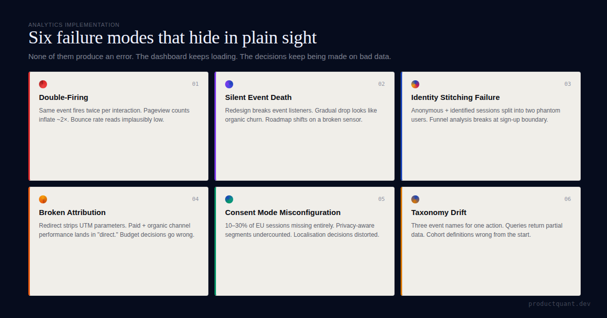 Dashboards show you what's being tracked — not what's missing, double-counting, or silently broken. The 6 failure modes that hide in plain sight, and how to find yours.