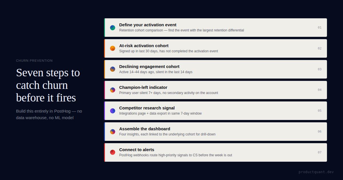 A churn dashboard that tracks cancellations tells you what already happened. An early warning dashboard tracks the signals that precede the decision — weeks upstream. Five signals, seven steps, no data warehouse required.