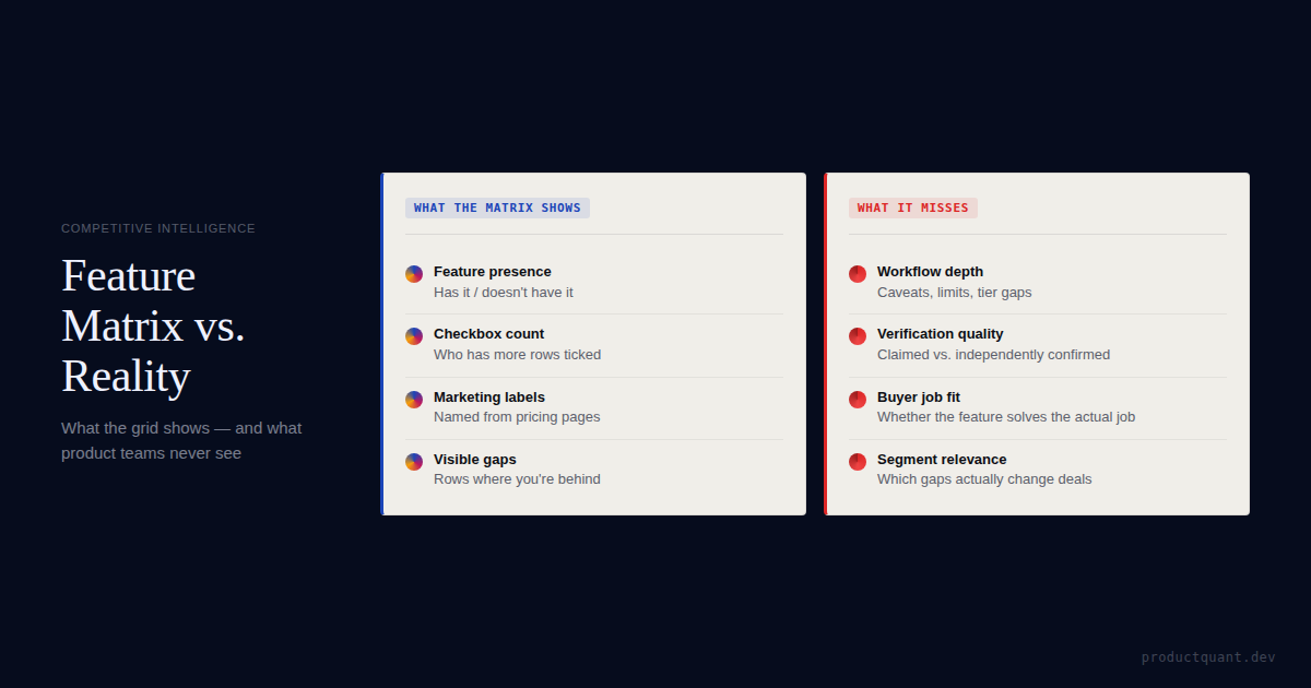 A better matrix compares depth, verification, and buyer relevance instead of turning visible feature parity into roadmap panic.