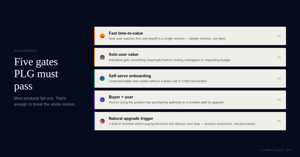 PLG is a structural outcome, not a default growth playbook. If buyer, user, activation, and upgrade mechanics do not line up, self-serve signups become a distraction instead of a motion.