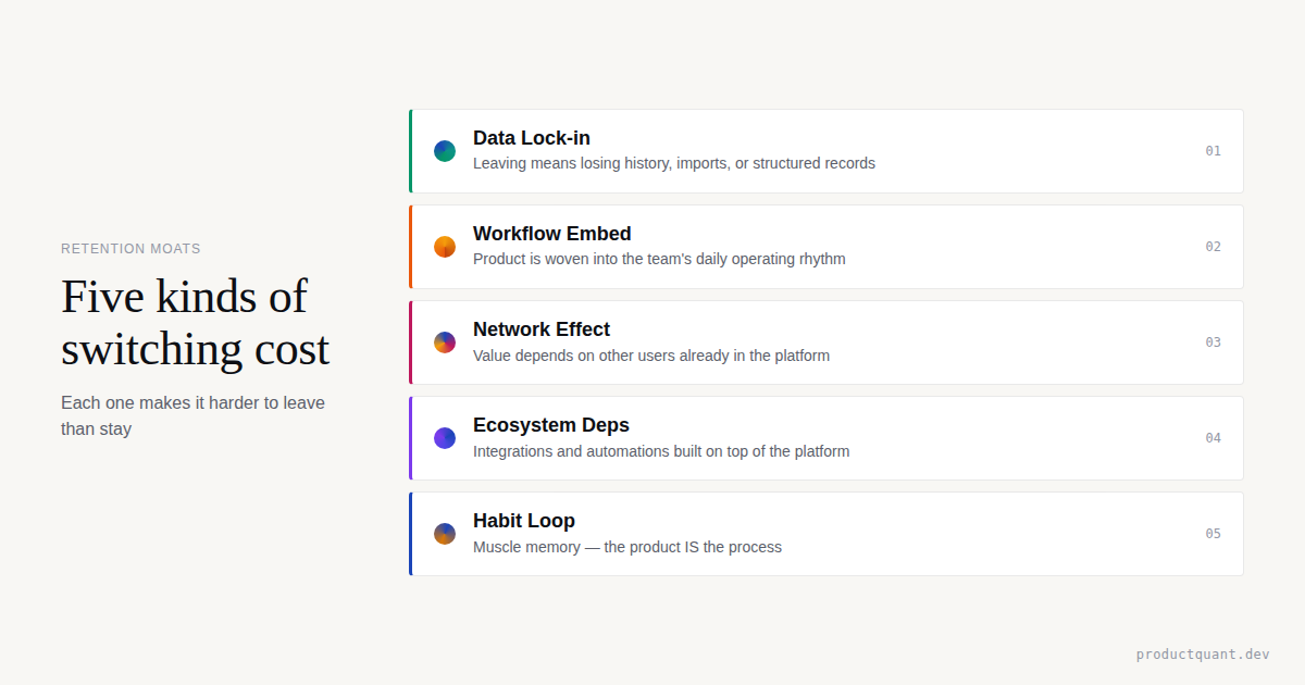 Retention is not just satisfaction. This article shows how to audit data lock-in, workflow embedding, network density, ecosystem lock-in, and habit loops more honestly.