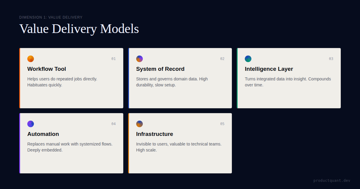 Workflow tools, systems of record, intelligence layers, automation platforms, and infrastructure products each create different defaults for growth.