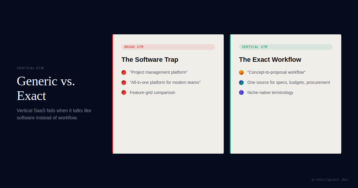 A practical GTM framework for niche SaaS: speak the buyer's workflow language, choose the real anti-competitor stack, narrow the beachhead, and resist adjacent segments too early.