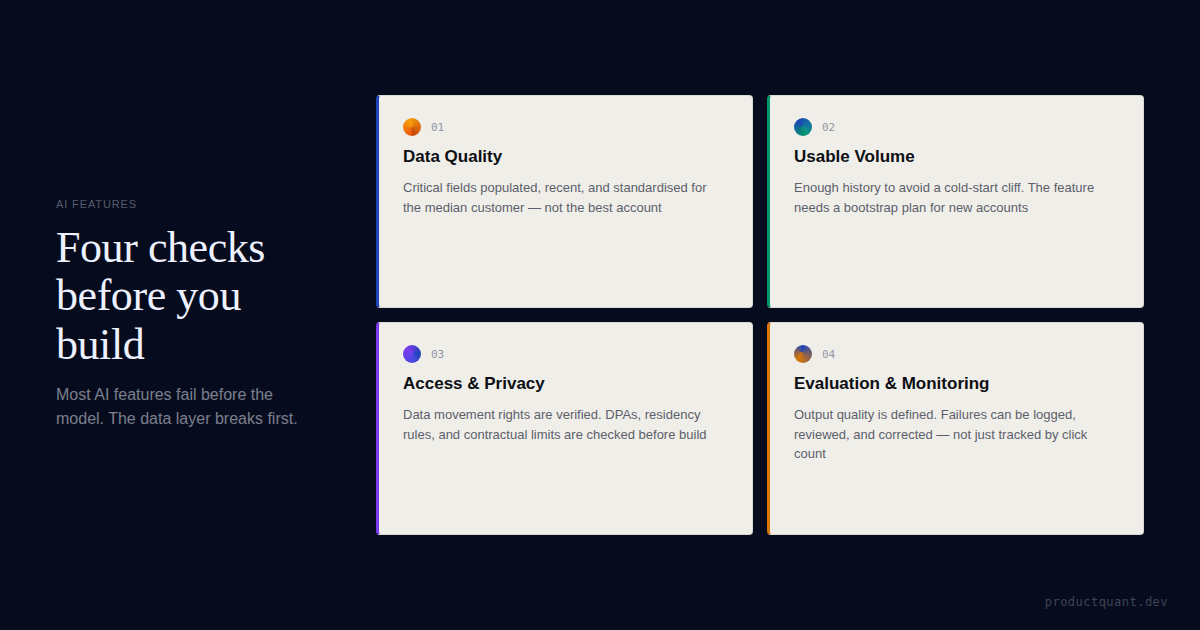 A practical readiness audit for SaaS AI features: check median-customer data quality, cold-start risk, access, privacy, and security before the model debate starts.