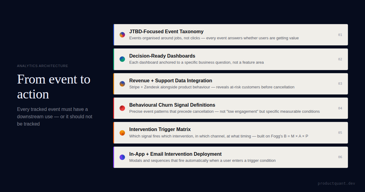 How to build a product analytics system where every tracked event has a downstream use — from JTBD event taxonomy through Stripe revenue intelligence, behavioural churn signals, and automated in-app intervention.