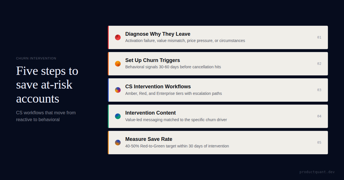 Complete churn intervention playbook for B2B SaaS. CS workflows, trigger-based outreach, save rate benchmarks, and real examples.