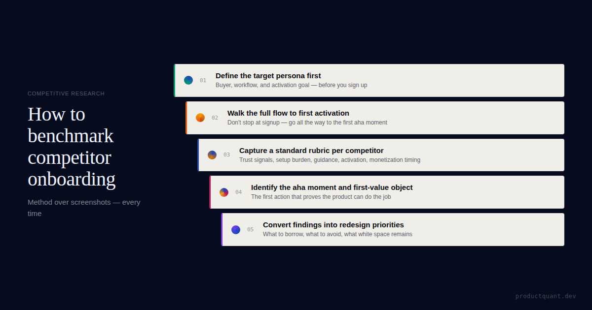A practical competitive onboarding method for B2B SaaS teams: define the persona, benchmark trust signals and setup burden, identify first-value objects, and turn cross-product patterns into activation redesign priorities.
