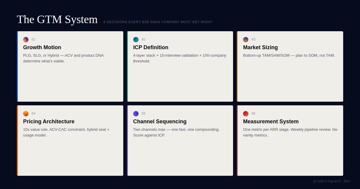 A 7-step go-to-market framework for B2B SaaS: ICP sequencing, motion selection, pricing alignment, channel strategy, hiring sequence, metrics by ARR stage, and how to execute a GTM reset without burning pipeline.