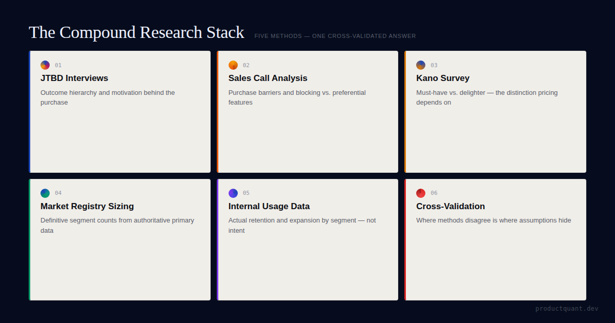 What happens when you run JTBD interviews, sales call analysis, Kano surveys, and market sizing simultaneously — and use the cross-validation to fix the assumptions your roadmap was built on.