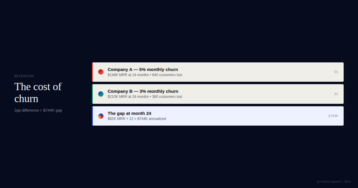 Two companies. Same acquisition engine. Same starting MRR. A 2pp monthly churn difference produces a $744,000 annualized revenue gap after 24 months. Here is the full cost-of-churn math.