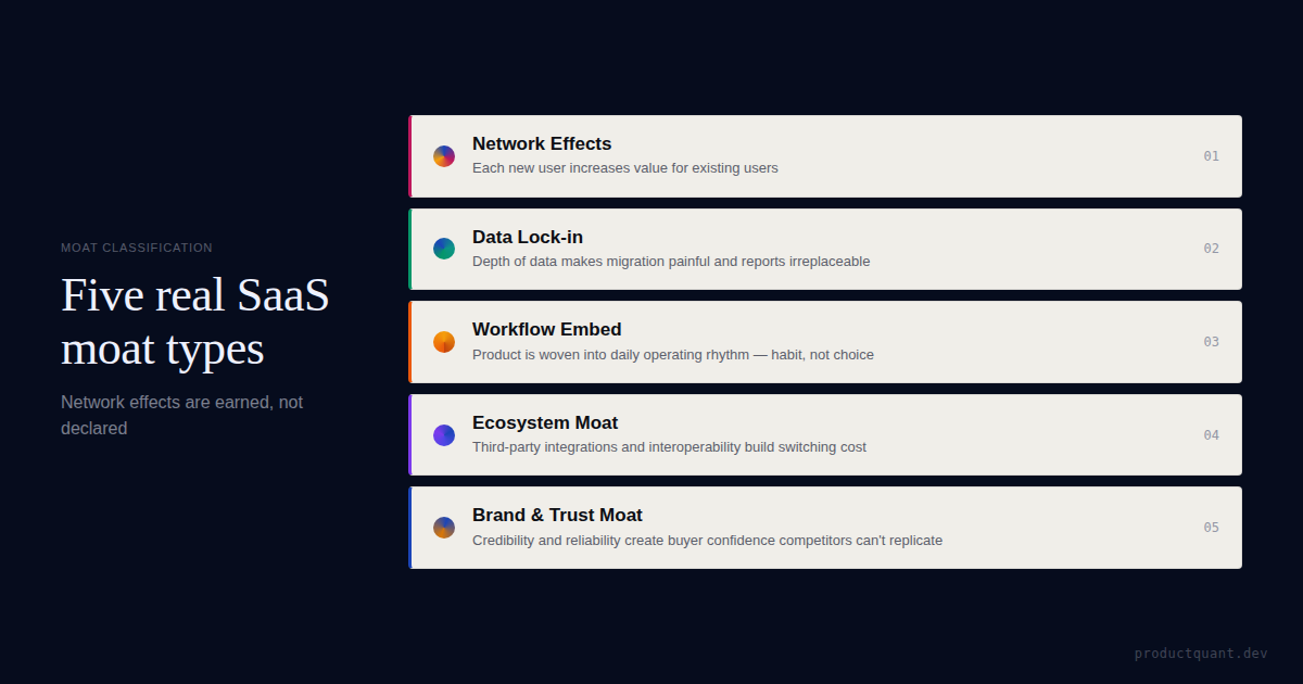 Many SaaS teams claim network effects when they really have a different moat. This article shows how to classify the mechanism honestly.
