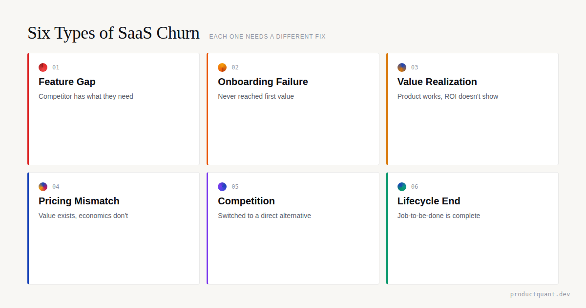 Value-not-realised, wrong ICP, competitor-switch, budget-cut, champion-left, feature-gap. Each has a different signal in your product data and a different intervention. Most teams treat them the same.
