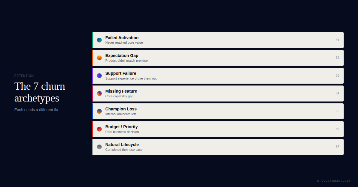 Churn is not one problem. It is a composite of 7 structurally different failure modes — each requiring a different fix. Here is how to diagnose which archetype is actually driving your number.